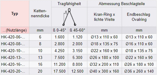 Produktnummer | Ketten-Nenndicke | Nutzlänge | Tragfähigkeit ß (0 - 45°) | Preis | |