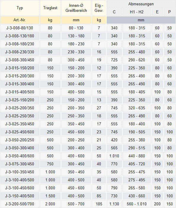 J-3-150-400/500 | 150 [mm] | 400-500 [mm] | 1.500 [kg] | 4.265,00 € | Übernehmen |