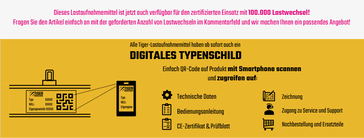 Unsere Lastaufnahmemittel verfügen über ein Typenschild mit Hersteller, Tragfähigkeit, Eigengewicht und Typen-Nr. sowie auch einen QR-Code mit Zugriff auf die EG-Konformitätserklärung.