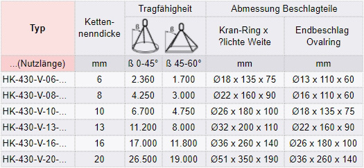 Produktnummer | Ketten-Nenndicke | Nutzlänge | Tragfähigkeit ß (0 - 45°) | Preis | |