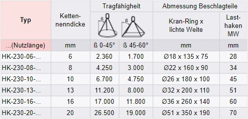 Produktnummer | Ketten-Nenndicke | Nutzlänge | Tragfähigkeit ß (0 - 45°) | Preis | |