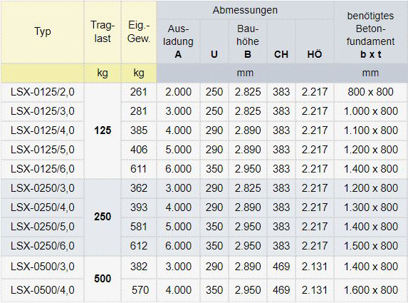 | LSX-OK-0500/4,0 | 4.000 [mm] | 500 [kg] | 4.184,00 € | Übernehmen |