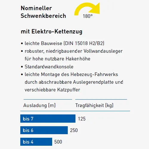 Mit kürzerer Ausladung steigt die maximal zulässige Tragfähigkeit, während die kompakte Wandmontage wertvolle Bodenfläche freihält.