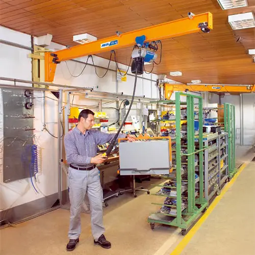 • Der Kran ist für den halbkreisförmigen Arbeitsbereich ausgelegt und eignet sich ideal für wandnahe Arbeitsplätze, Maschinenbeschickung oder Montagebereiche.