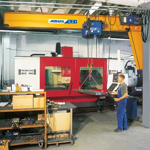 Die Optimierung der Hubhöhe bei einer Tragfähigkeit von 3,2 t wird durch den Einsatz eines ABUS Elektro-Seilzugs realisiert. Elektrische, zweistufige Antriebe in allen Bewegungsrichtungen ermöglichen ein feinfühliges Einbringen und Entnehmen von Werkstücken und Vorrichtungen.