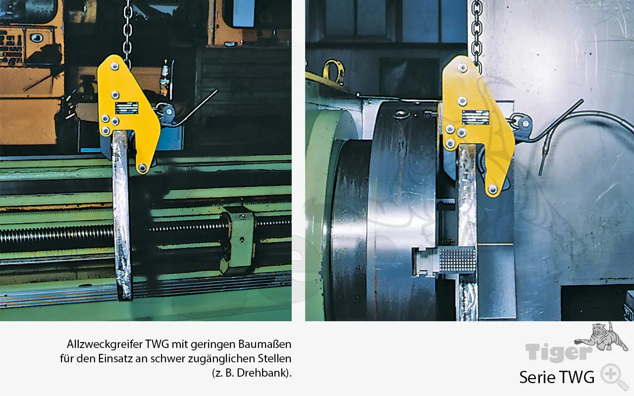 Der Hebegreifer TWG mit geringen Baumaßen kommt besonders beim Einsatz an schwer zugänglichen Stellen (z. B. Drehbank) zum Einsatz.
