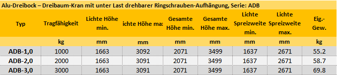 Alu-Dreibock-Kran ADB mit unter Last drehbarer Ringschraube als Aufhängung