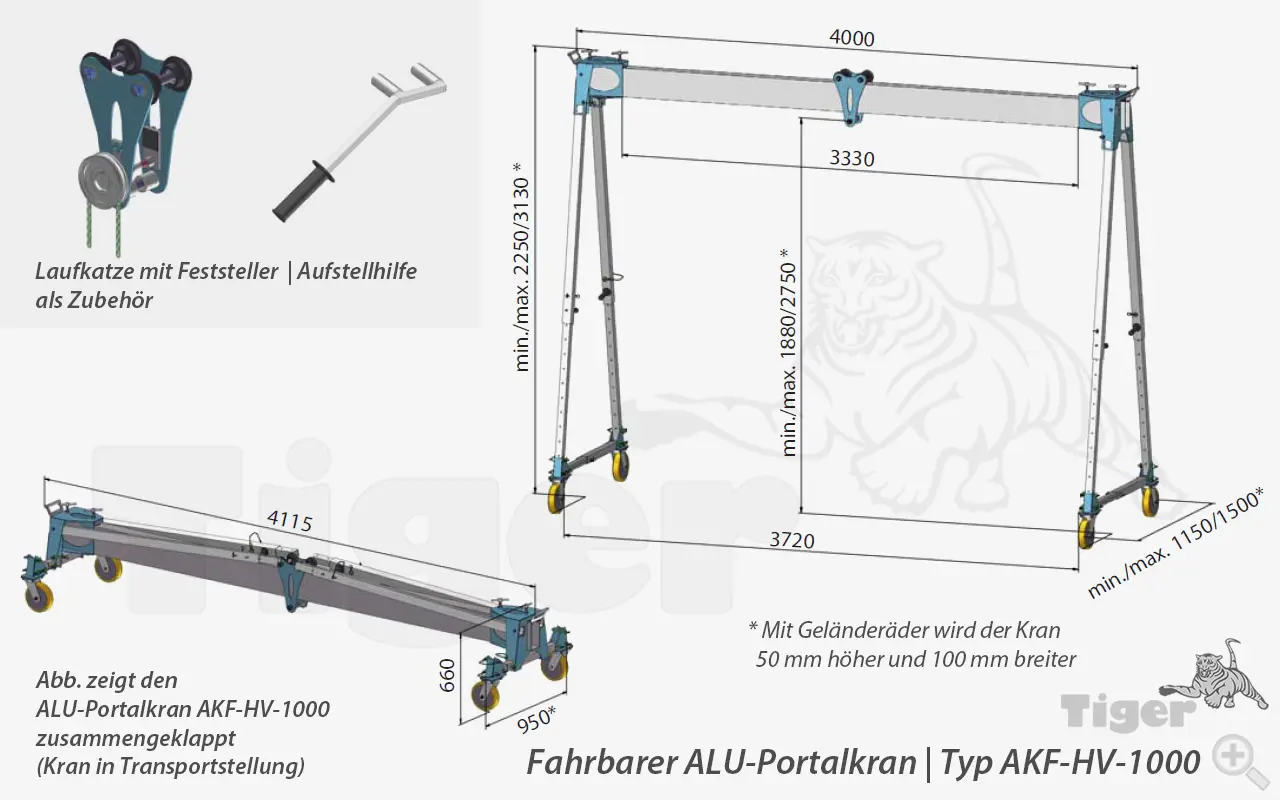 Alu-Portalkran AKF-HV-1000 - Der unter Last verfahrbare, höhenverstellbare und klappbare Leichtbaukran