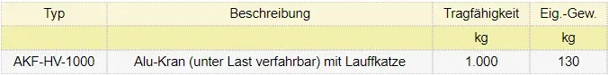 | AKF-HV-1000 | 1.000 [kg] | 3.650,00 € | Übernehmen |