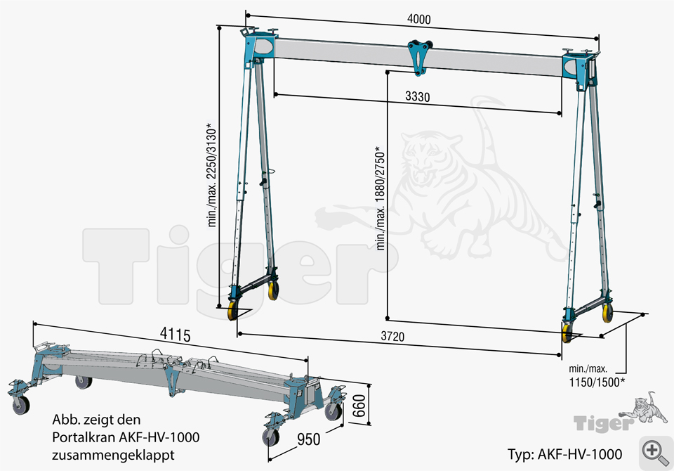 Alu-Portalkran AKF-HV-1000 - Der unter Last verfahrbare, höhenverstellbare und klappbare Leichtbaukran