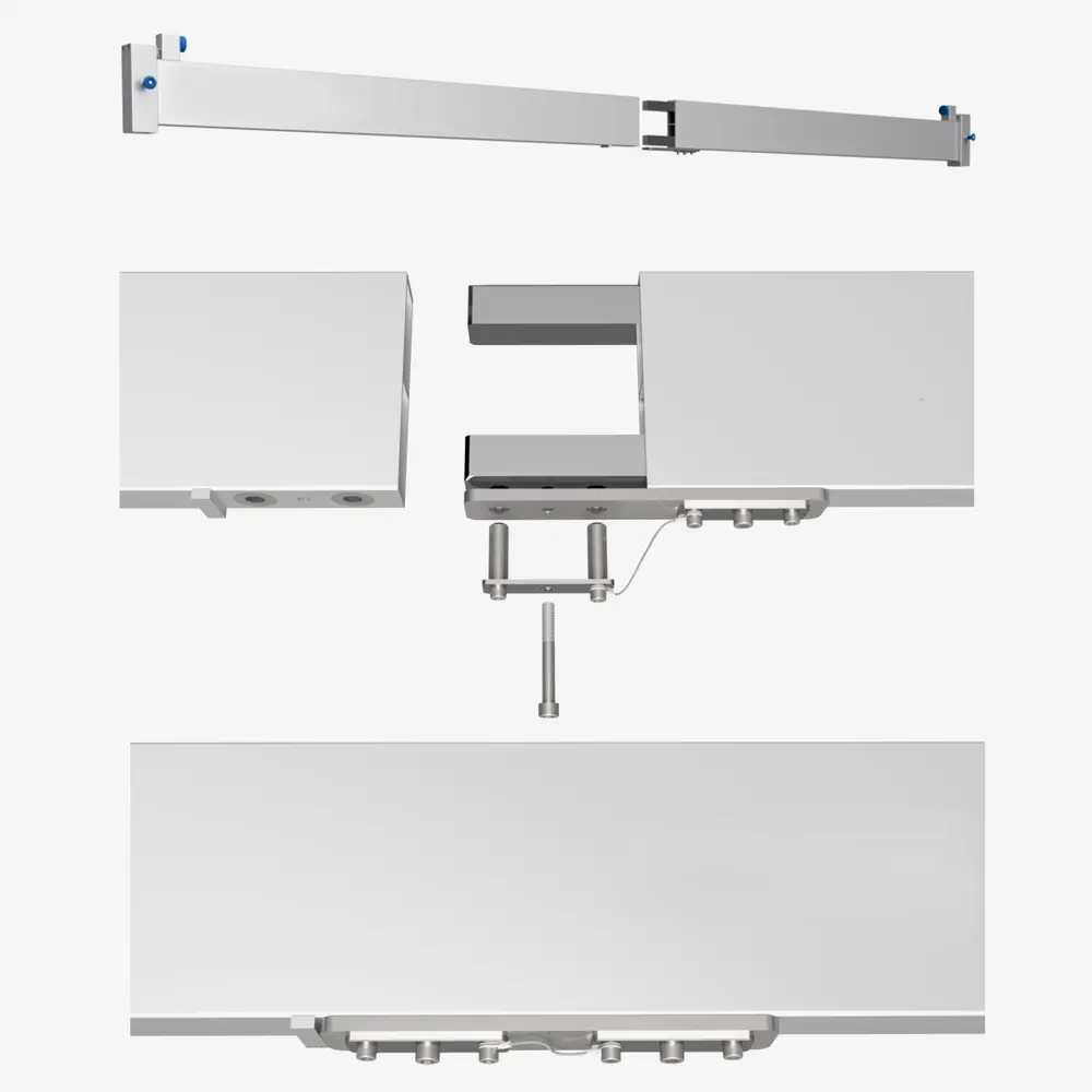 Die Teilstücke des Kranträgers werden einfach ineinander geschoben und dann verschraubt. Zentrierbuchsen und Passhülsen garantieren bündige Übergänge, damit auch die Laufkatze nicht hakt. Wenn Sie eine andere Teilung wünschen (z. B. 1,5 m + 2,5 m oder 1 m + 3 m), so teilen Sie uns dies einfach bei der Bestellung im Feld Bemerkung mit.