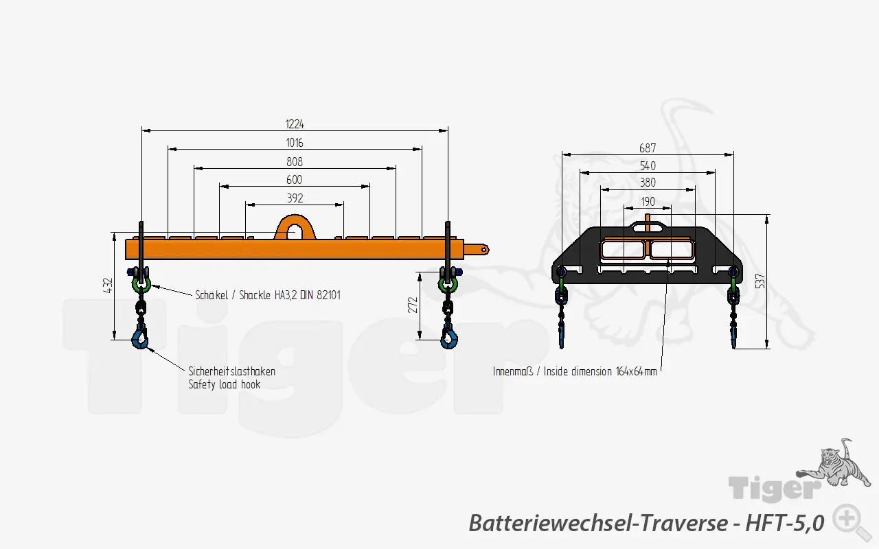 - Typ HFT-5,0: Hebegeschirr mit Ketten und Lastahaken für 48-80V Batterien für Nieder-, Hochhubwagen und Frontstapler bis max. 5.000 kg