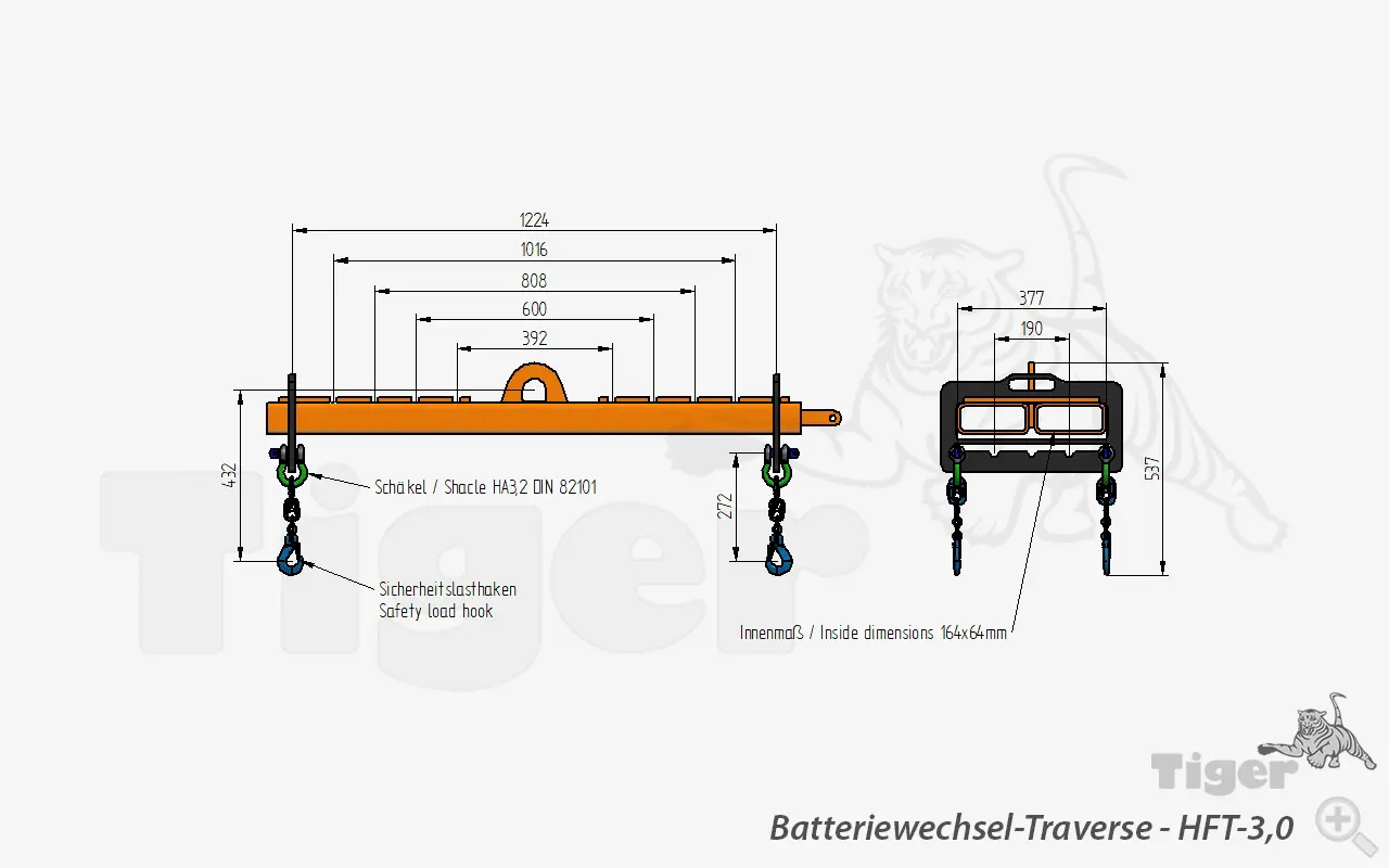 - Typ HFT-3,0: Hebegeschirr mit Ketten und Lastahaken für 48-80V Batterien für Nieder-, Hochhubwagen und Frontstapler bis max. 3.000 kg