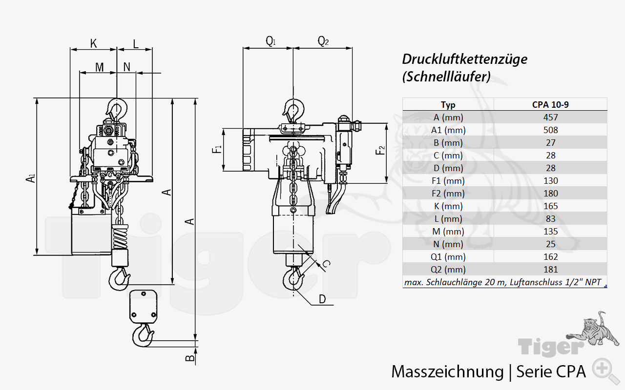 - max. Schlauchlänge Typ CPA-10-9: 20 m (Luftanschluss 1/2" NPT)