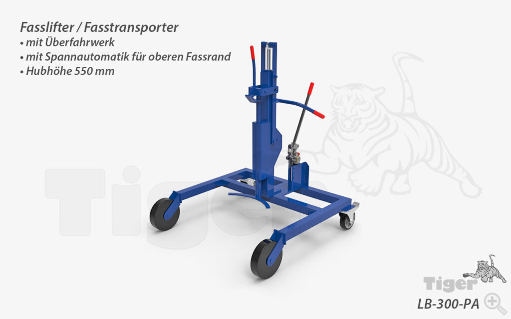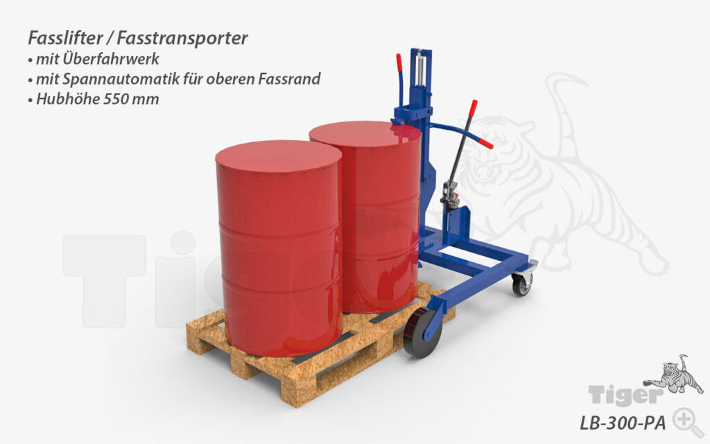 Wir führen diese Fasslifter mit Überfahrfahrwerk und Einfahrfahrwerk.