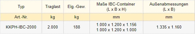 Maße IBC-Container (L x B x H): | 1.000 x 1.200 x 1.160 / 1.000 x 1.200 x 1.000 [mm] |
