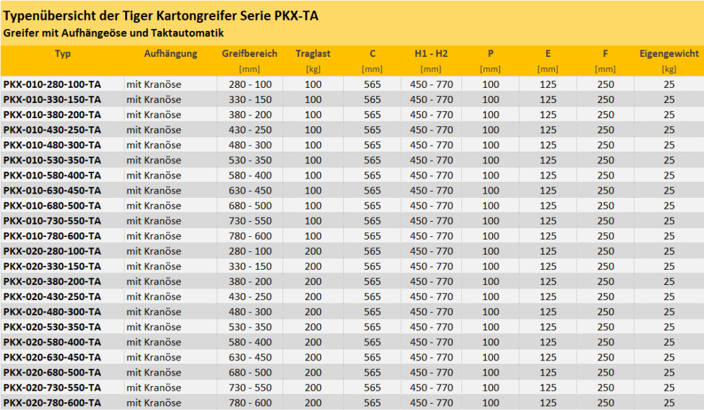 Die Tiger Kartongreifer Serie PKX-TA für Kartons sind zum Heben und Transport von Kartonagen und Holzkisten mit einem Kran konzipiert. Durch die Verwendung einer Taktautomatik ist bei der Lastaufnahme und beim Absetzen der Last kein Benutzereingriff mehr erforderlich! Die Automatikfunktion optimiert den Workflow beim Kartontransport nachhaltig. Mit den beidseitig angebrachten großen Andruckplatten greift der Kartongreifer PKX-TA eigenstabile Pakete und Holzkisten schonend per Reibschluss.