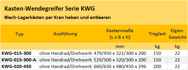 Die Tiger Kastenwendegreifer KWG, KWG-HR und KWG-SR heben folgende Lagerkästen: