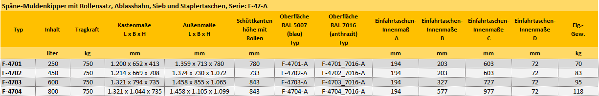 F-4701_7016-A | 250 [l] | RAL 7016 (Anthrazitgrau) pulverbeschichtet | 750 [kg] | 737,00 € | Übernehmen |