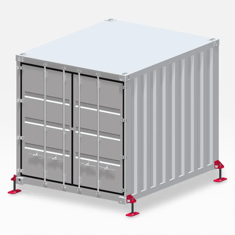 Dieses Container-Nivelliersystem besteht aus vier Spindelhebern zum direkten Anheben eines ISO-Containers vom Boden aus.