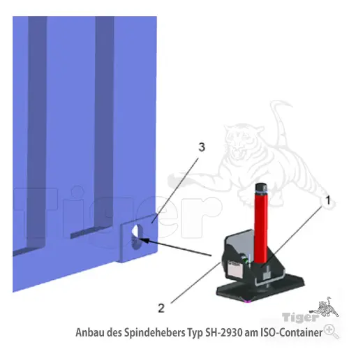 Jeder einzelner Spindelheber wird seitlich an der unteren ISO-Ecke (ISO 1161) angebaut. Das Hubelement besteht aus einer Spindel-Mutter-Paarung.