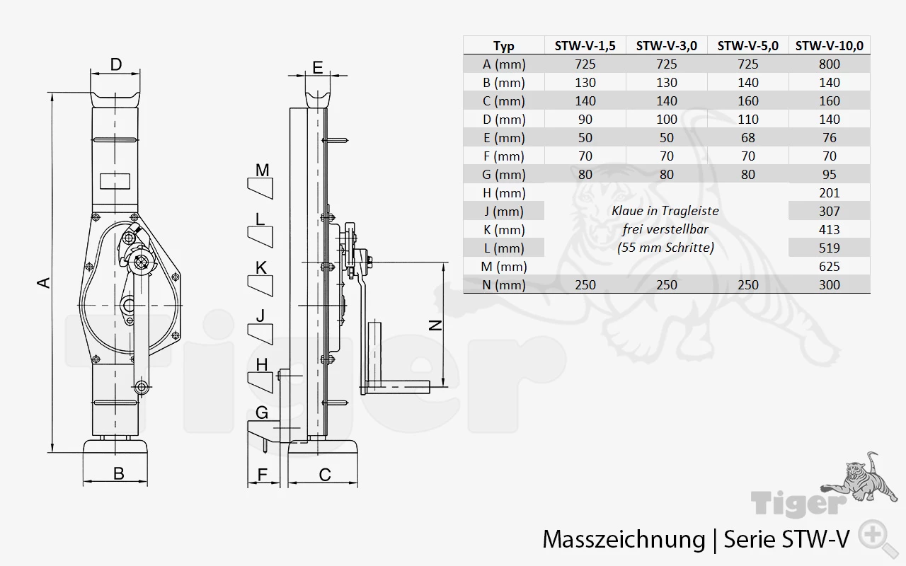 Die Stahlwinden STW-V wurden konstruiert, um Lasten aus unterschiedlichen Höhen über die gesamte Länge der Stahlwinde aufnehmen bzw. absenken zu können.Hierbei wird die verstellbare Klaue einfach in der Tragleiste auf die entsprechende Ansetzhöhe angepasst.