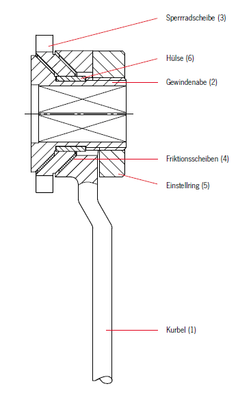 Durch Drehen an der Kurbel (1) im Uhrzeigersinn, verspannt sich diese über die Friktionsscheiben (4) mit der Sperrradscheibe (3) und Gewindenabe (2) zu einer Einheit. Dabei drehen sich alle Bauteile in die gleiche Richtung und die Sperrklinken (hier nicht dargestellt) rasten wechselweise in die Verzahnung an der Sperrradscheibe ein. Dadurch wird die Last sicher, in jeder beliebigen Position gehalten.