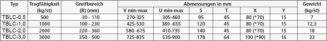 | TBLC-0,5 | 270-325 [mm] | 30-110 [mm] | 500 [kg] | 748,00 € | Übernehmen |