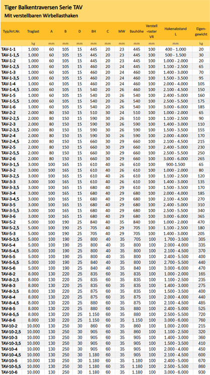 Tiger Balkentraversen mit verstellbaren Wirbellasthaken