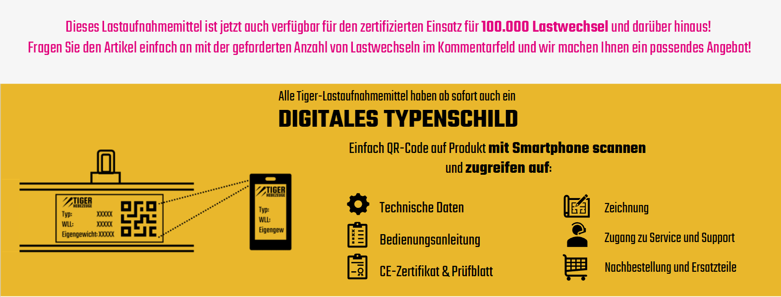 Unsere Lastaufnahmemittel verfügen über ein Typenschild mit Hersteller, Tragfähigkeit, Eigengewicht und Typen-Nr. sowie auch einen QR-Code mit Zugriff auf die EG-Konformitätserklärung.