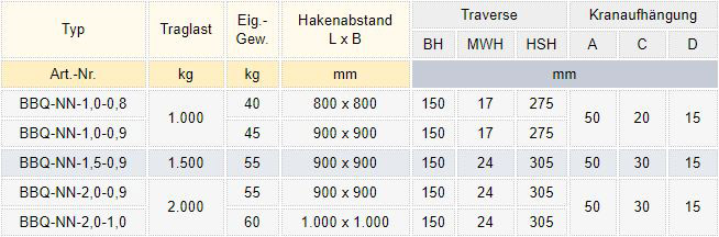 Bedingt durch die negative Bauhöhe hängt diese Krantraverse unausgewogen im Kranhaken und wird sich im Leerzustand zur Seite neigen. Der Hebevorgang unterliegt daher einer aufmerksamen Bedienung, wobei der Lastschwerpunkt deutlich unterhalb der Anhängepunkte liegen muss.