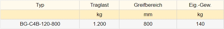 BG-C4B-120-800 | 800 [mm] | 1.200 [kg] | 6.747,00 € | Übernehmen |