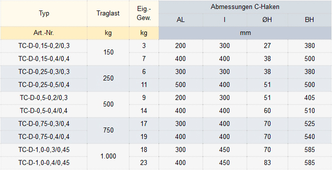 Bei der Ausführung TC-D verzichtet man zugunsten des geringeren Eigengewichtes auf das Gegengewicht, sodass der C-Haken von Hand in der Waage gehalten werden muss. Bei Belastung im Lastschwerpunkt (Mitte 4/4-Tragdorn) richtet sich der Tragdorn in eine Sicherheitsneigung von ca. 5° nach oben aus.