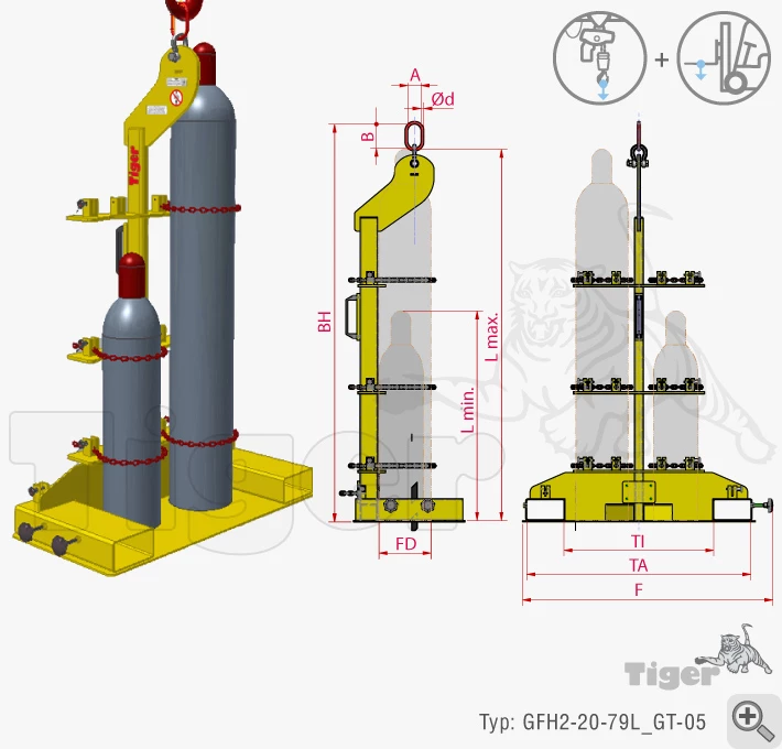 Tiger Gasflaschenheber GFH für den Kranbetrieb oder kombinierten Kran- und Staplerbetrieb