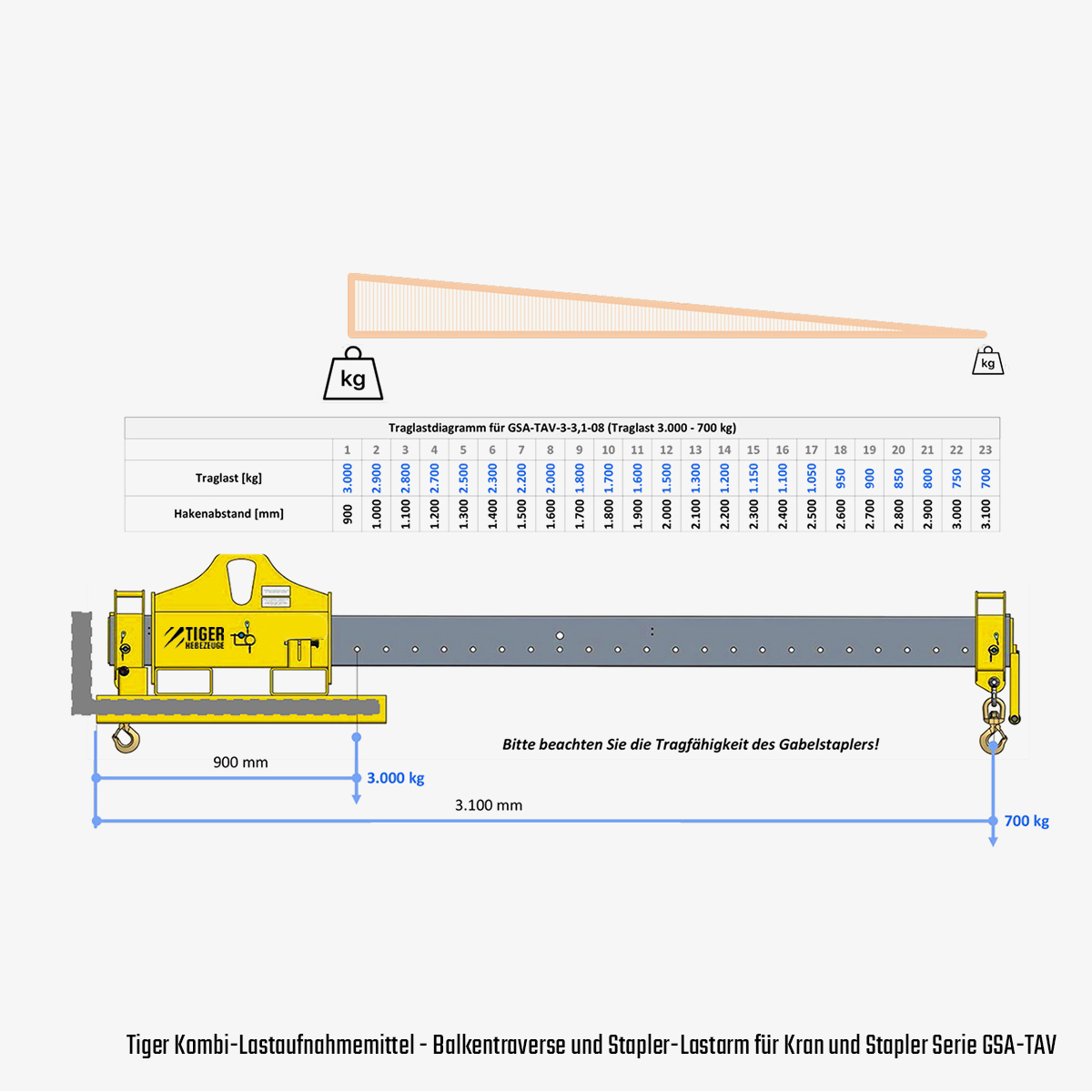 Traglast 700 kg bei Hakenabstand 3.100 mm