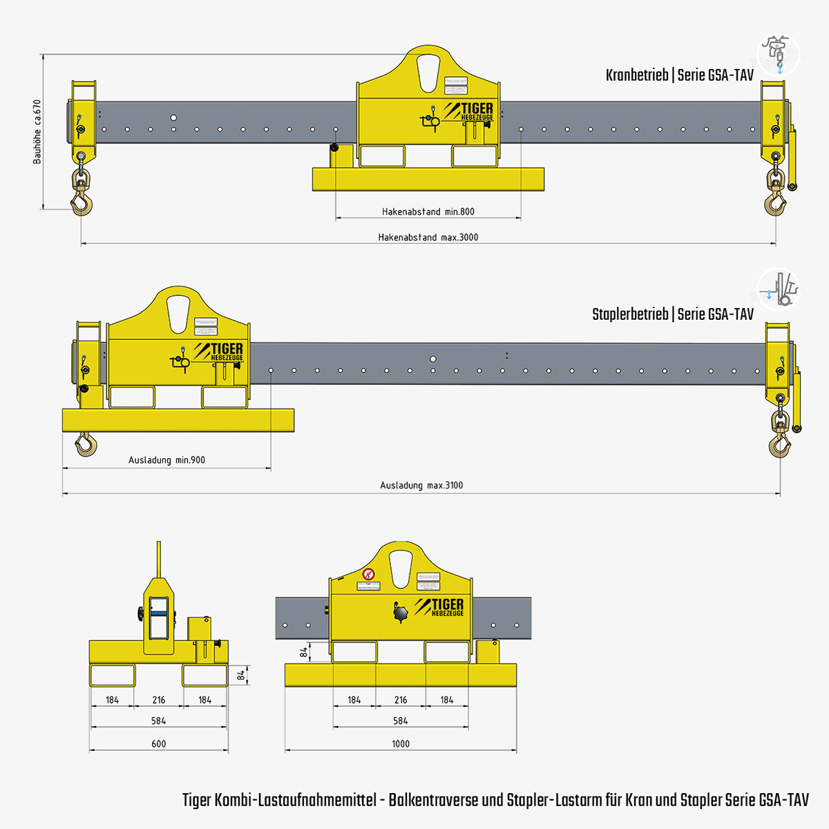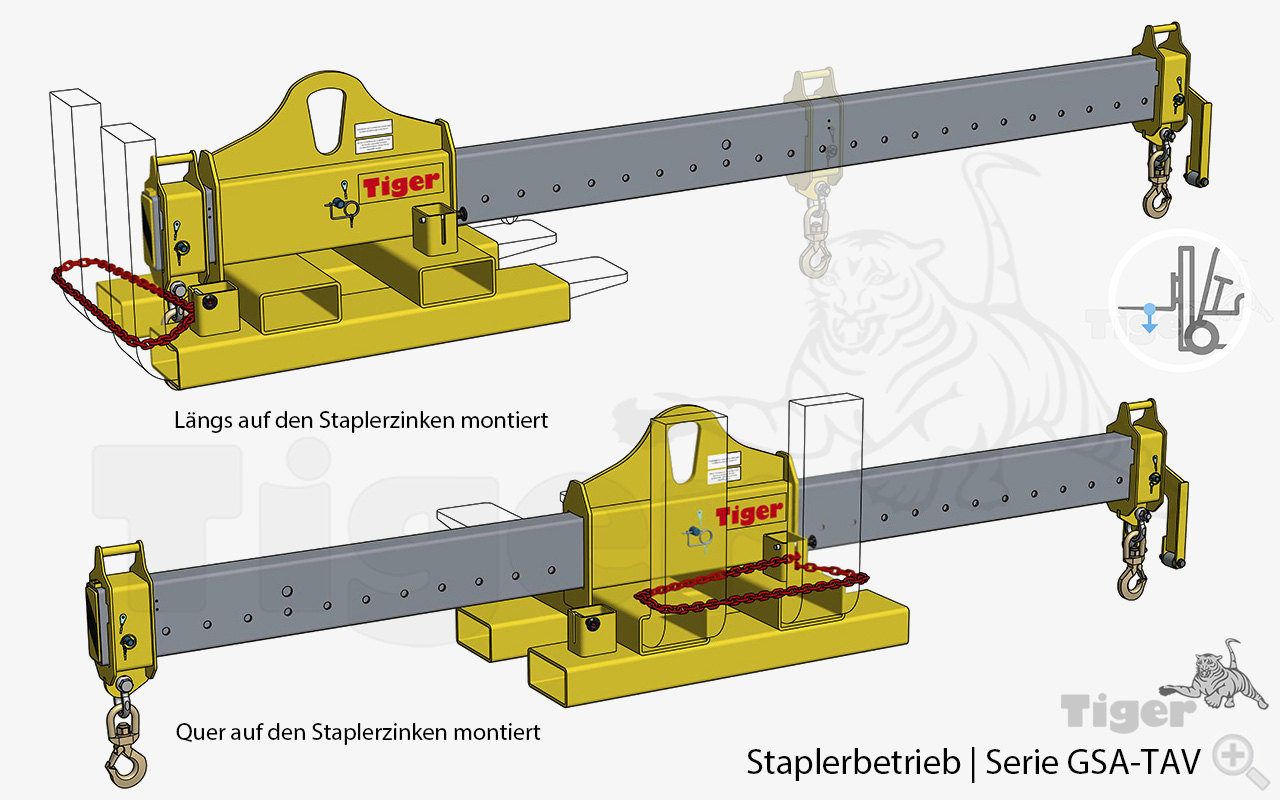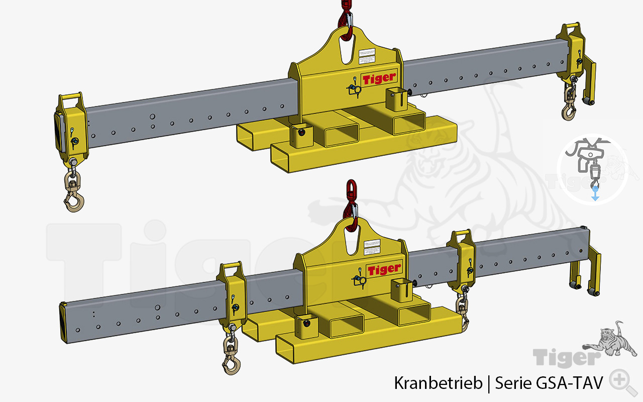 Tiger Kombi-Lastaufnahmemittel GSA-TAV - Verstellbare Hakentraverse und Stapler-Lastarm für den Einsatz am Kran und am Stapler