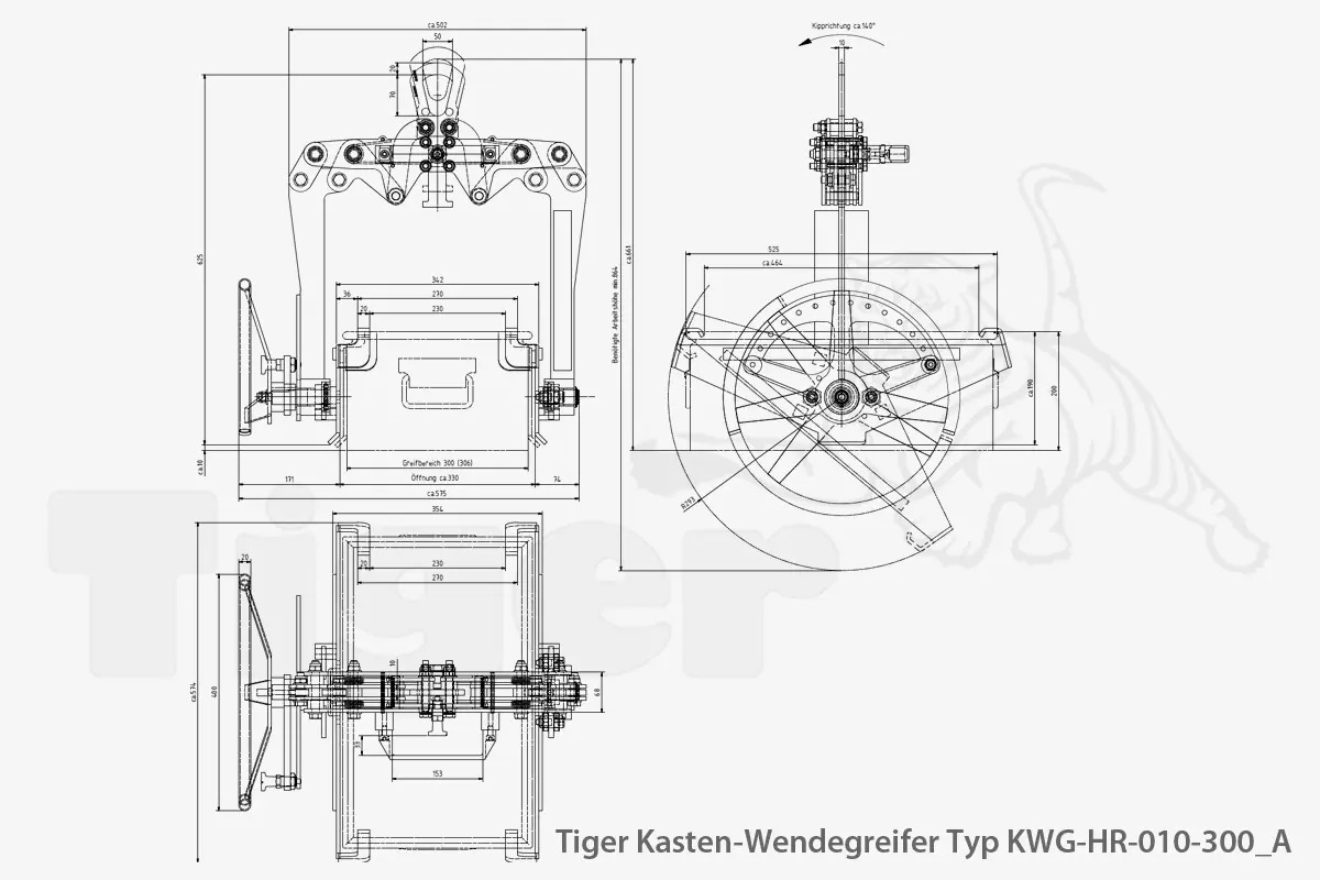 Tiger Kastenwendegreifer mit Handrad zum Heben und Leeren von Lagerkästen