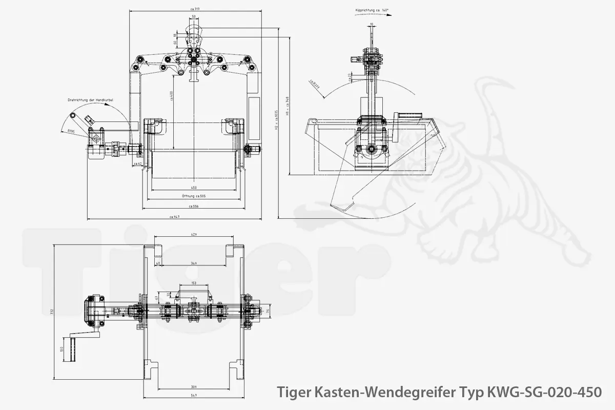 Tiger Kastenwendegreifer mit Kurbelgetriebe zum Heben und Leeren von Lagerkästen