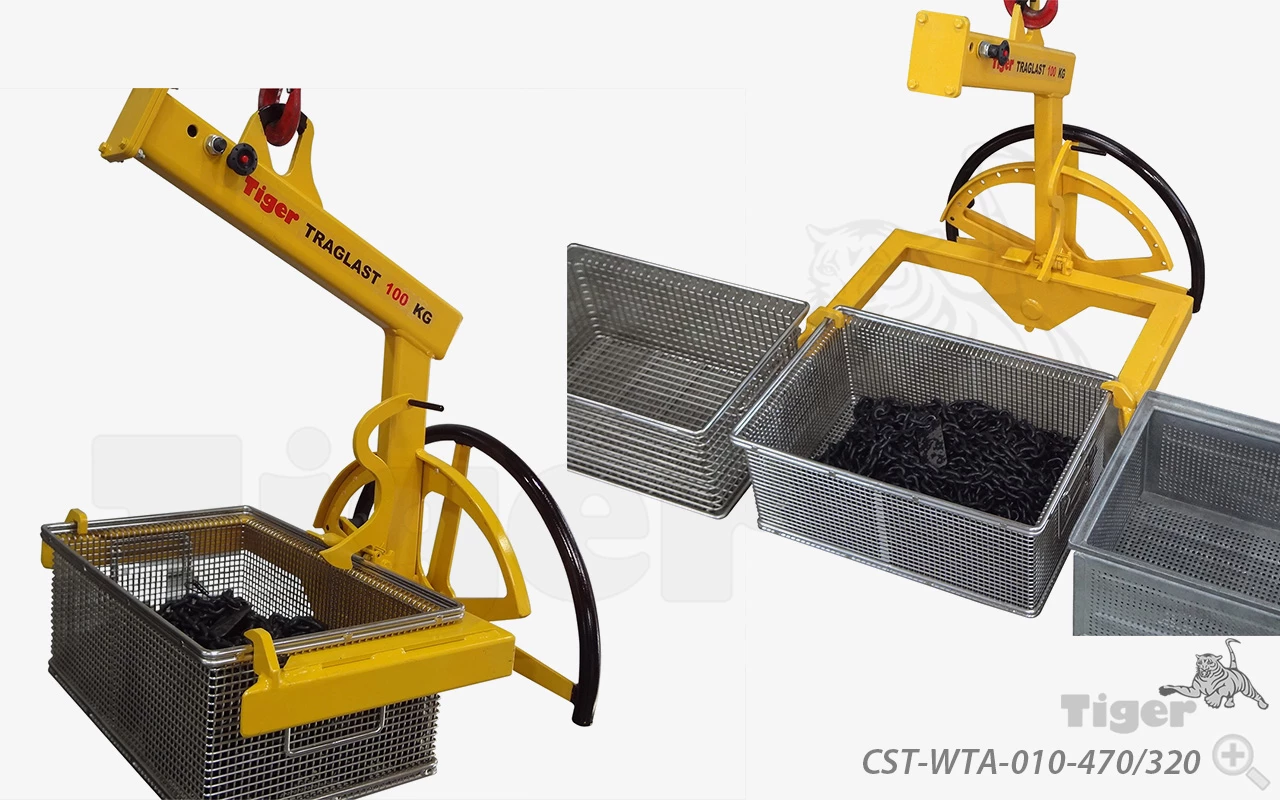 Wir passen unsere Tiger Sonder-Kastengreifer für Lagerkästen der Serie Sonder-CST-WTA-010-470/320 auch gerne an Ihre konkrete Hebesituation an.