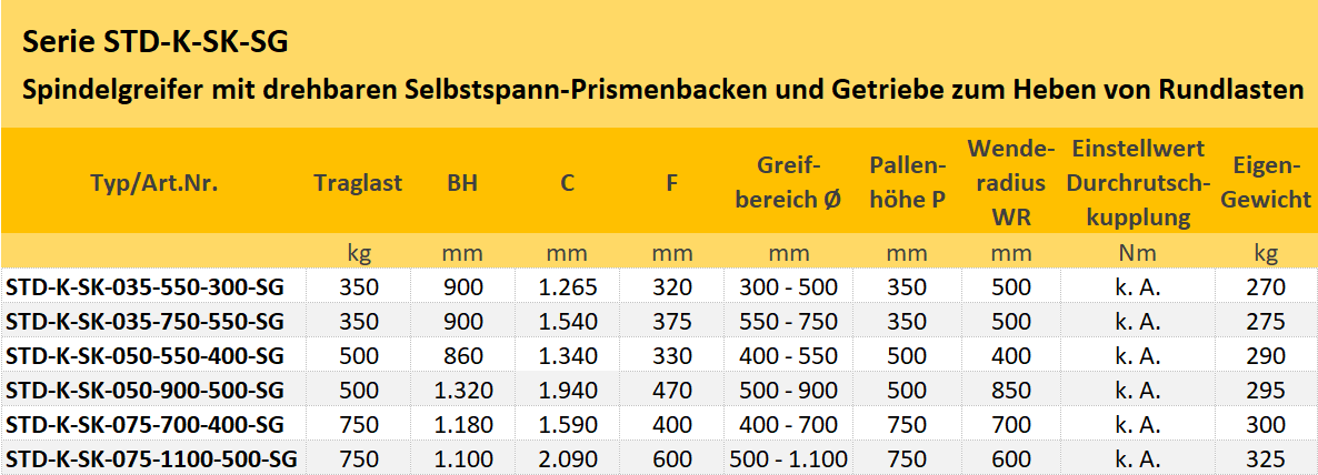 Der Spindelgreifer STD-K-SK-SG ist speziell entwickelt worden, um das sichere und effiziente Heben von Rundmaterial zu gewährleisten. Mit seinen selbstspannenden und drehbaren Prismenbacken bietet dieser Greifer eine hervorragende Lösung für verschiedenste industrielle Anwendungen, bei denen Rundmaterialien sicher transportiert und positioniert werden müssen.