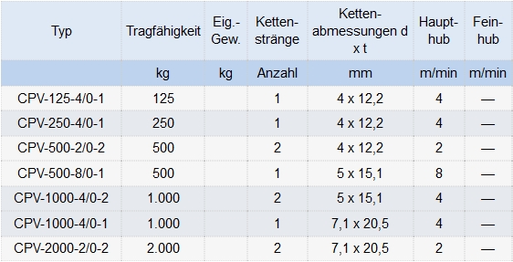CPV-500-2/0-2-4 | 2 [m/min] | 4.000 [mm] | 500 [kg] | 2.176,00 € | Übernehmen |