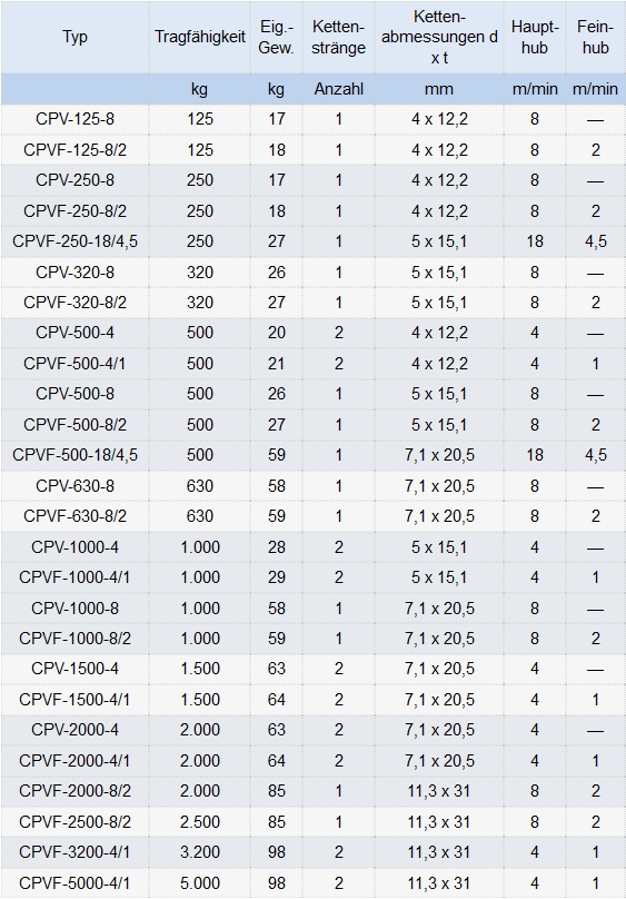 | CPV-250-8-4 | 8 [m/min] | 4.000 [mm] | 250 [kg] | 1.317,00 € | Übernehmen |