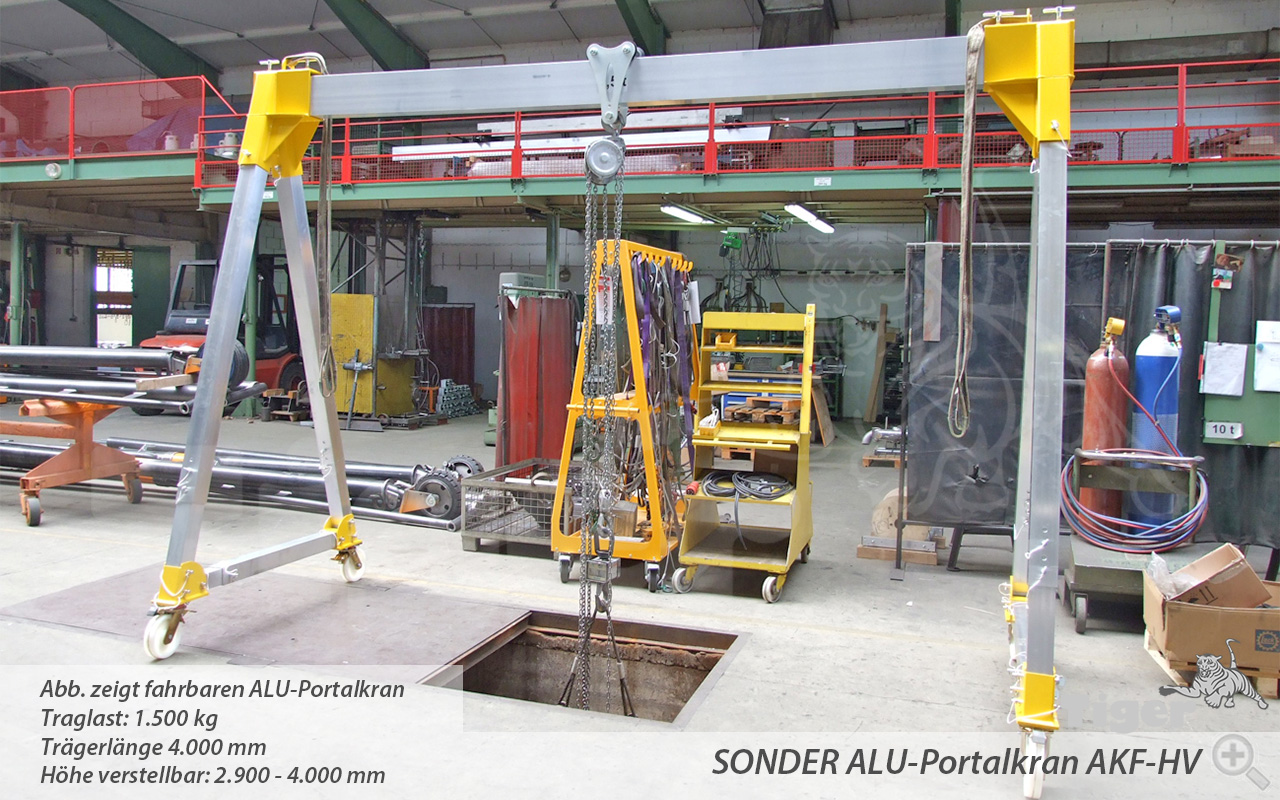 Aluminium-Portalkran mit Laufkatze, verfahrbar unter Last, höhenverstellbar und klappbar