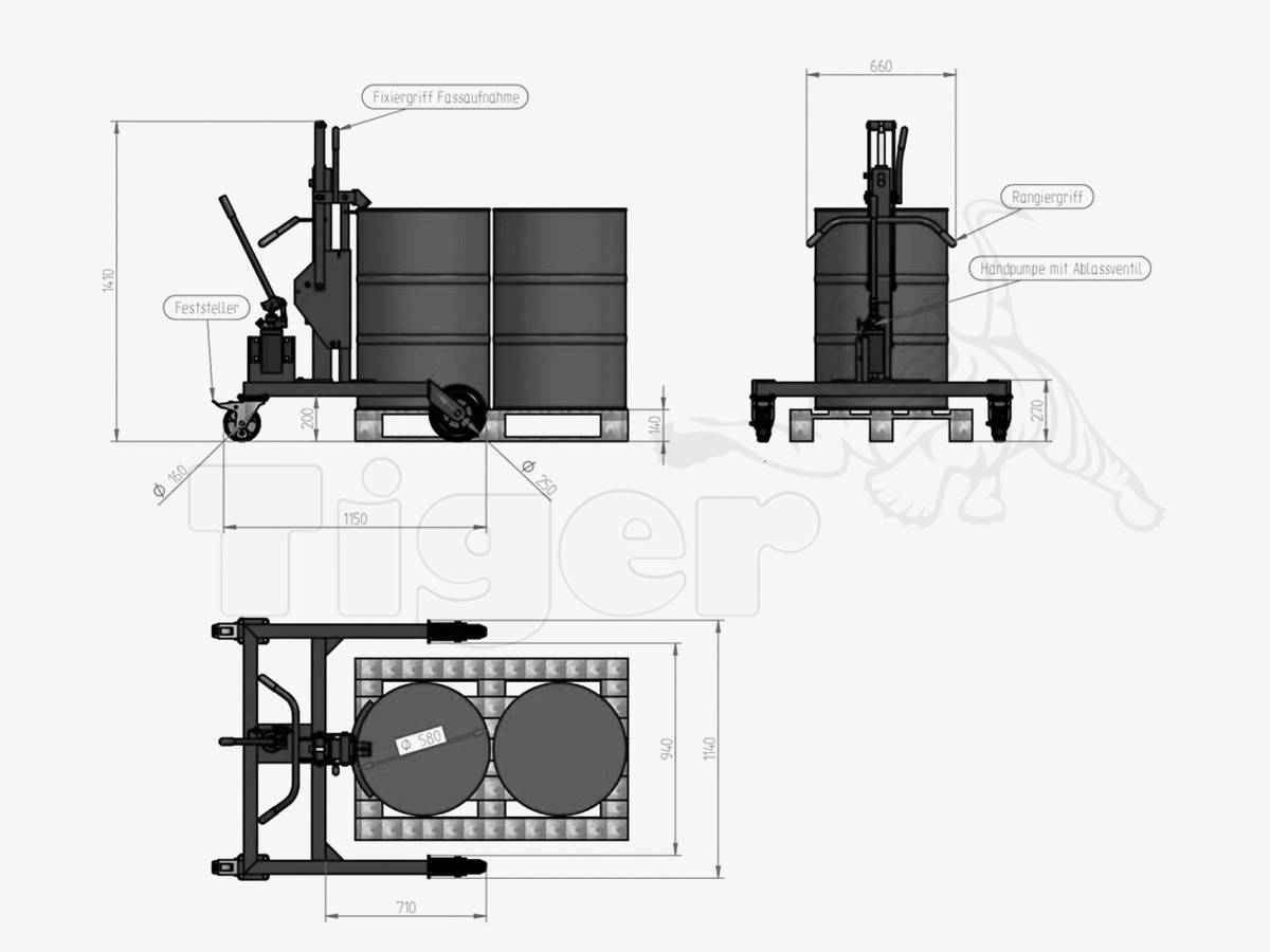 - Fass-Hebesystem mit Überfahrwerk oder Einfahrwerk