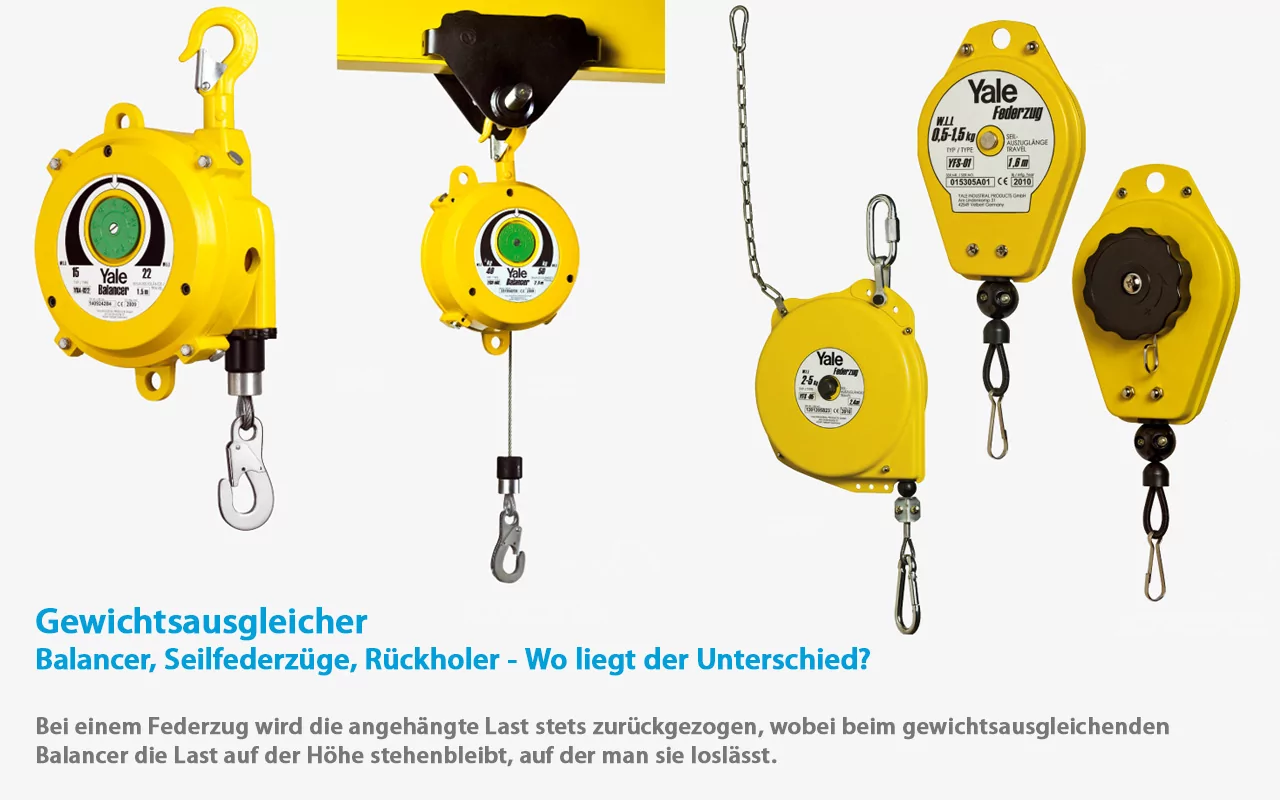 Balancer, Seilfederzüge Balancer, Federzüge Rückholer bzw. Federzüge mit Arretierung sind spezielle Gewichtsausgleicher, die den Anwender von der Gewichtskraft einer Last entlasten.